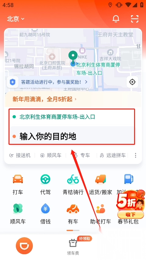 (1)打开app进入首页,在下图所指位置,能够开启“顺风车”功能。