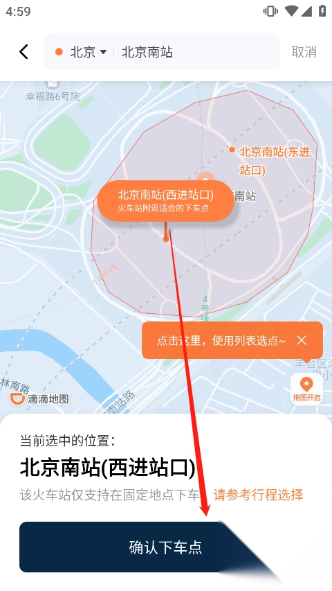 2、选择好目的地附近后,软件将自动确定地址,如果遇到下图所示火车站,软件采用固定地点下车模式,用户需要自动移动至目标地点下车或上车