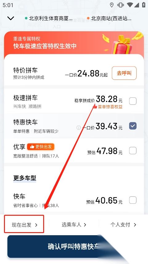 3、订单的默认时间为“现在出发”,点击下图所示位置可修改时间