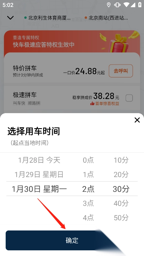 5、确定好预约时间后,下方支付页面也将切换为“预约快车”,接下来我们创建订单即可完成预约乘车操作