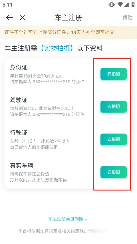 (4)证件补全的车主,可先上传部分证件,14天内补全即可提交审核,审核通过后就可以开始接单了