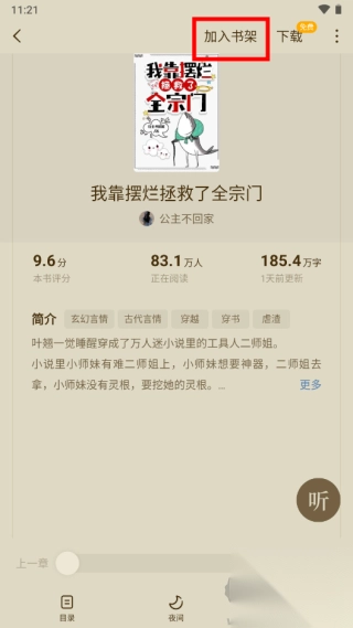 4、加入书架:要是遇到喜欢的小说,点右上角的“加入书架”,下次找起来就省事儿了。