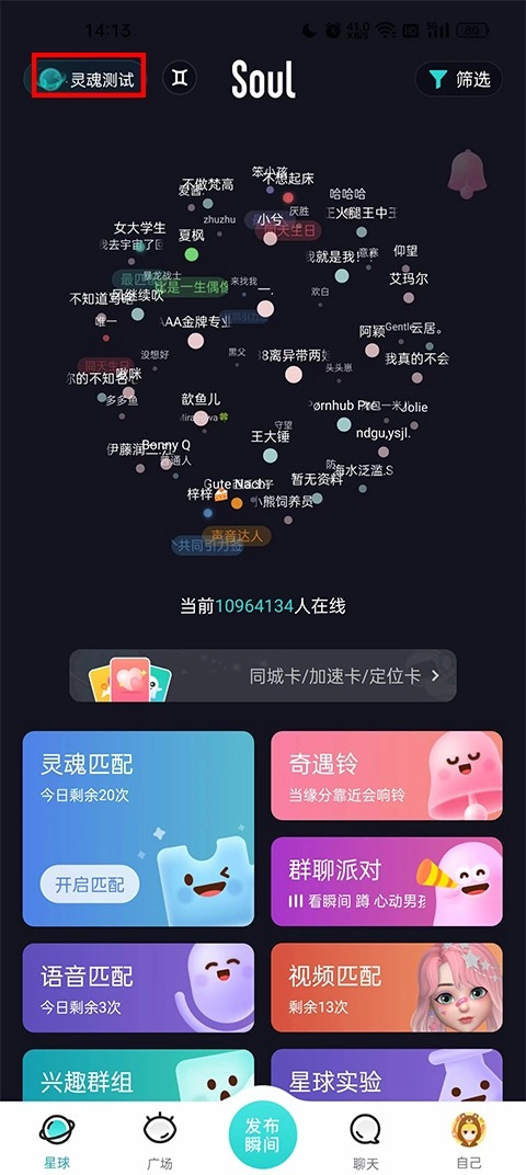 3、第一步,我们需点击左上角开展灵魂测试,唯有如此,方可匹配到与自身更为契合的异性。