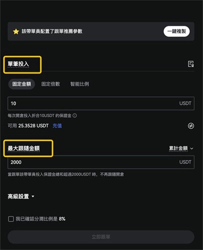 优化跟随者跟单下单时投入保证金的计算逻辑,单笔投入参数优先级高于最大跟随参数优先级。