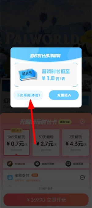 5、然后点击下次再说选项就可以免费体验游戏了