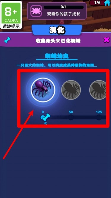 3.进化界面显示蜘蛛成长路径,收集足够资源可将幼蛛进化为更强形态,解锁更凶猛的技能与外观变异。