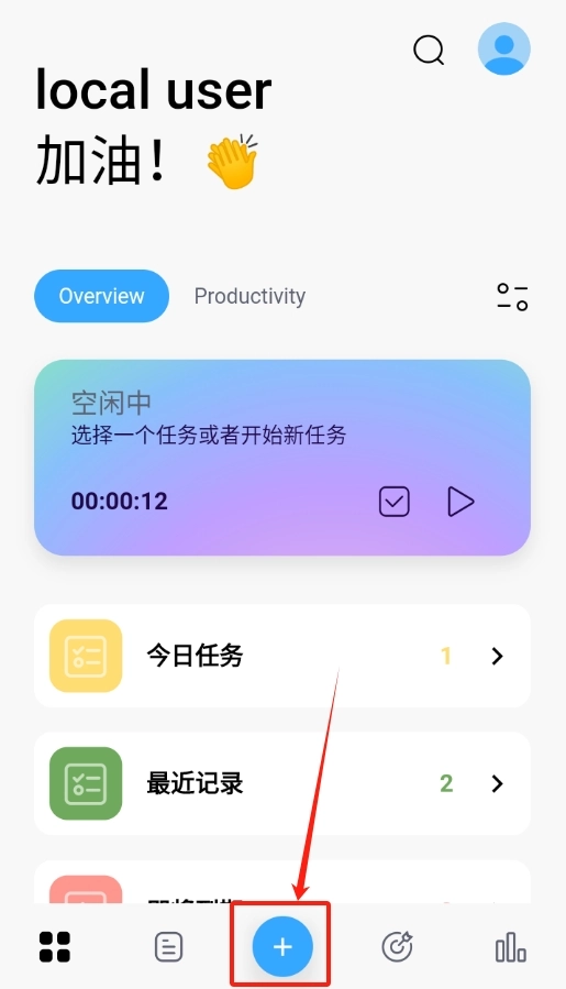 1. 开启timez时间记录,于主界面底部寻得加号图标并进行点击。