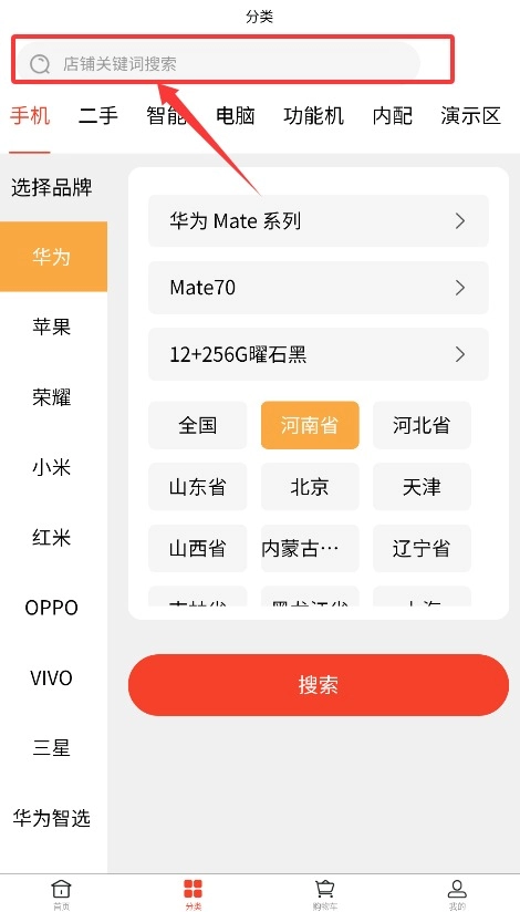 2、在分类页面通过搜索栏输入店铺名称,或直接浏览推荐品牌列表查找目标商家。