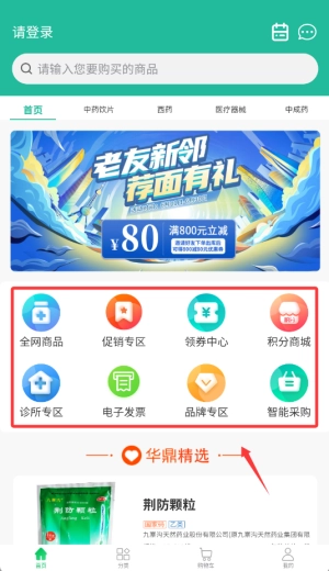 1、登录华鼎药业APP后,在首页位置找到"全网商品"入口,点击进入选购界面。