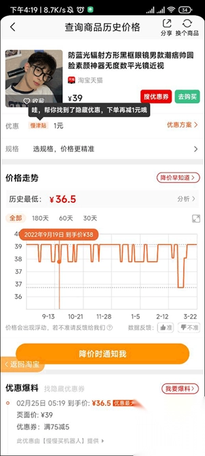 发现淘宝价格变动,不想错过低价?查查价格走势,设置降价通知,帮你监控全网商品价格。