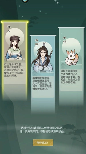 7、选择一位仙途领路人伴随修仙之路吧,仅外观不同,不影响后续游戏收益。