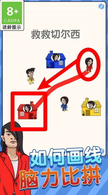 1.点击画线区域,在起点位置开始画线,将角色安全引导至目标房屋,保证连线顺畅完整,确保顺利过关。