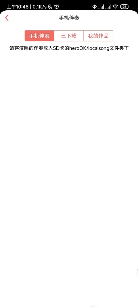 3、此时,我们尚未将伴奏上传至软件中。进入手机伴奏界面后,能看到提示,告知我们需把文件放入指定文件夹。这时,前往手机的文件管理处进行移动操作即可。