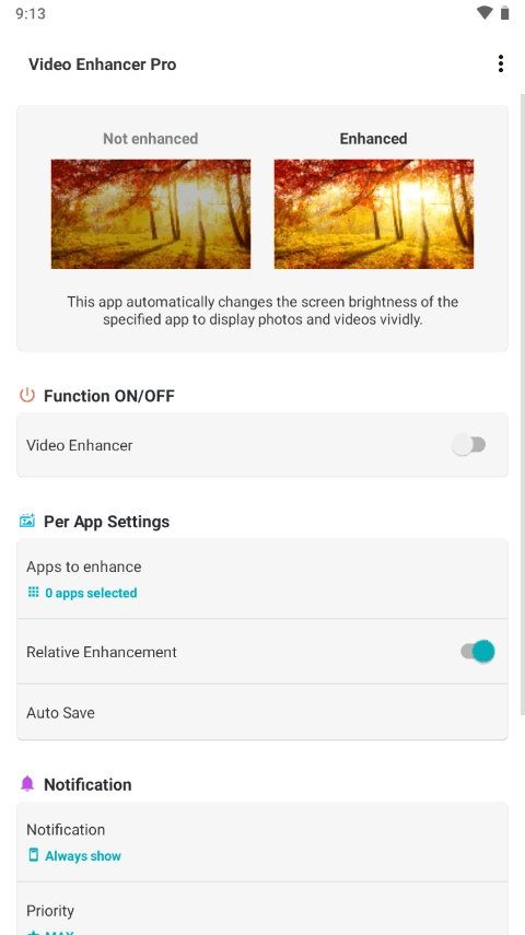 Video Enhancer Pro 作为一款智能显示优化软件,可依据您正在观看的视频或图片内容,实时自动调节屏幕亮度。比如,当您观赏暗色调的电影场景,该软件会智能提高亮度,使细节更为清晰;而在欣赏明亮的风光照片时,它又会自动降低亮度,防止光线刺眼。您仅需在首次使用时完成简单设置,此后每次打开视频或图片,软件便会自动适配最舒适的显示效果,无需反复手动调整。