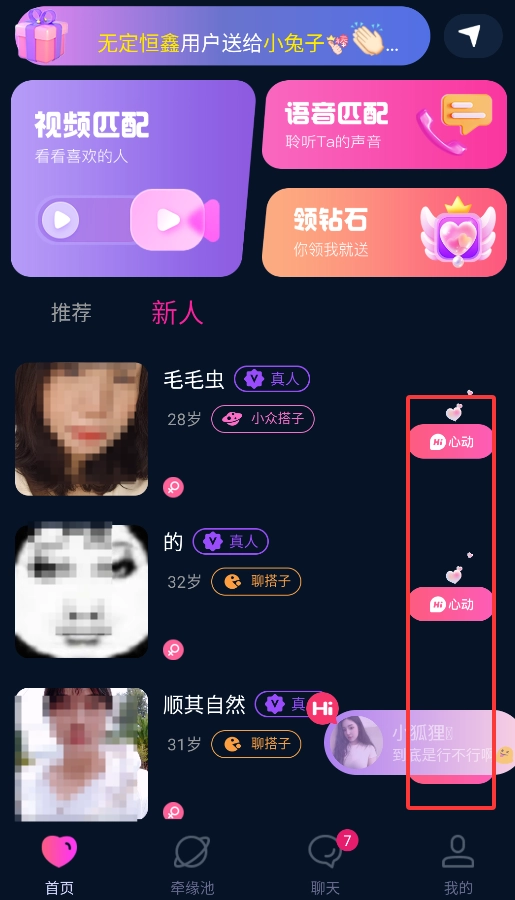 1、启动APP后,在推荐页浏览用户资料,遇到感兴趣的对象点击"心动"表达好感。