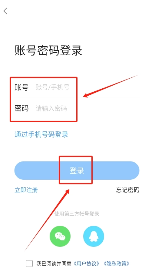 2、进入登录界面,在对应位置填入注册账号和设定密码,确认无误后点击登录完成操作。