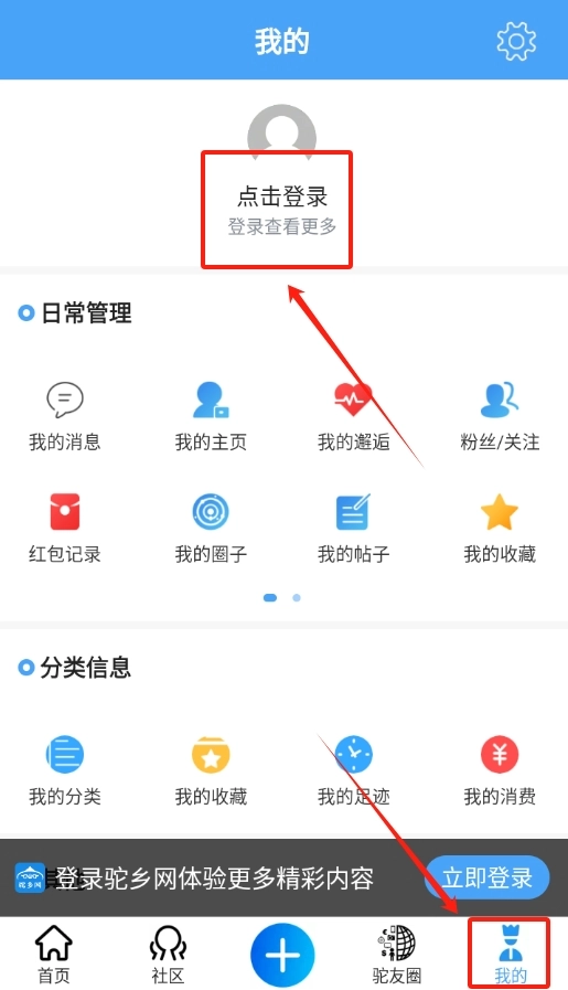 1、打开驼乡网招聘后,找到页面下方的 “我的” 选项进入,点击该页面中的 “登录” 按钮。