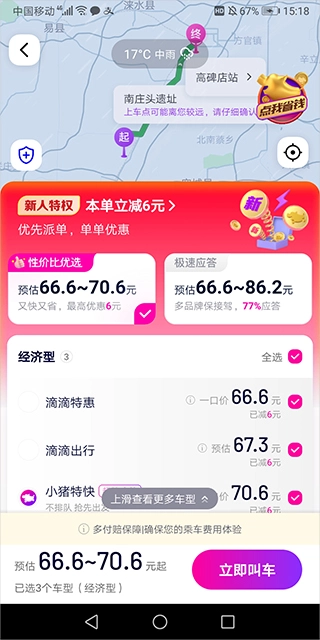 4、领取优惠券后,输入目的地,系统会自动规划合理路线并计算价格,确认支付便完成操作。