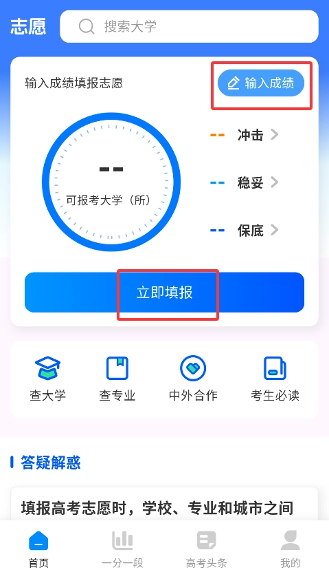 1、启动APP后,在智能填报系统输入高考分数、选科及地区,获取个性化院校推荐方案。