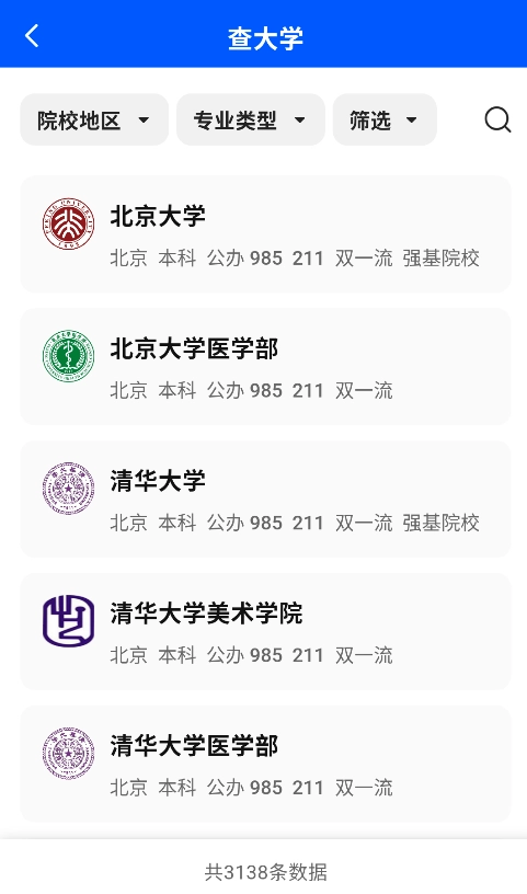 2、进入"院校库"可查询各高校历年分数线、专业设置、校园环境等详细信息。