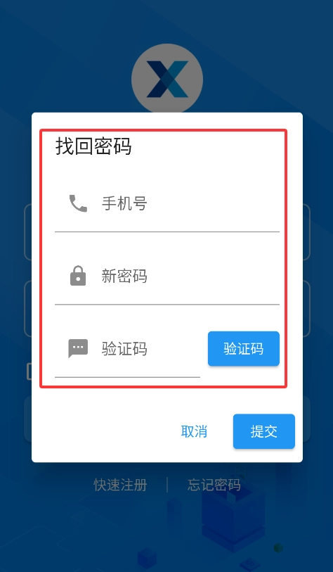 2. 输入用于注册的手机号以获取验证码,完成身份验证后,设置一个长度在6至20位之间的新密码(推荐采用字母与数字组合的形式),最后点击提交,即可完成密码修改。