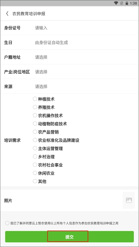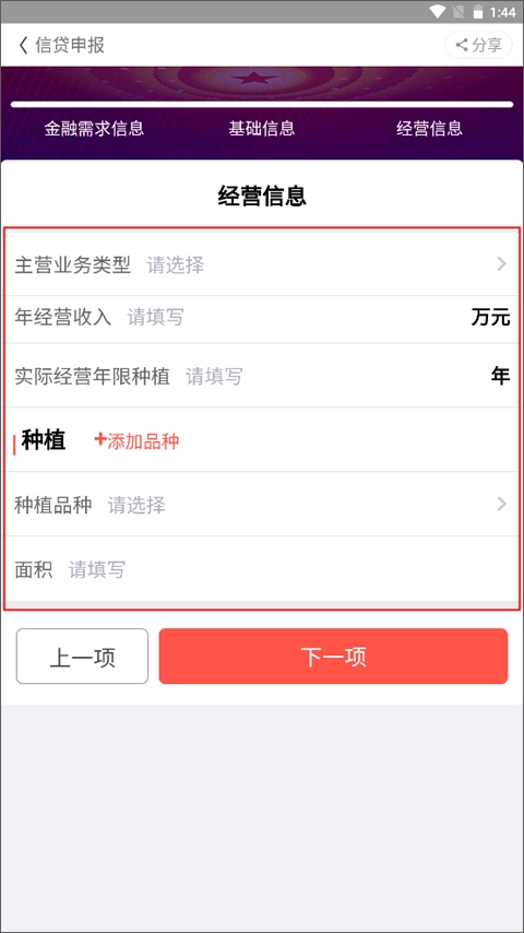 5、最后一项为经营信息,需选择主营业务类型、填写年收入及种植品种,提交这些信息后,等待审核通过即可。