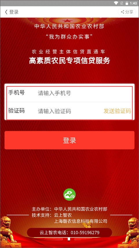 2、跳转到信贷服务登录界面,输入手机号和验证码进行登录操作。