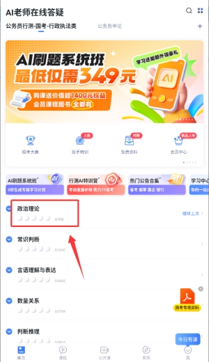 1、进入粉笔职教APP后,在首页分类中找到"政治理论"题库,点击进入模拟考试专区。