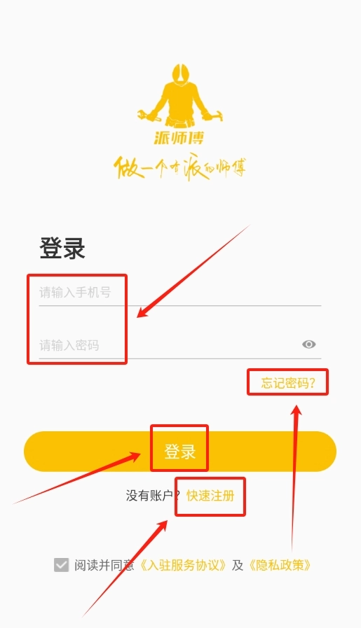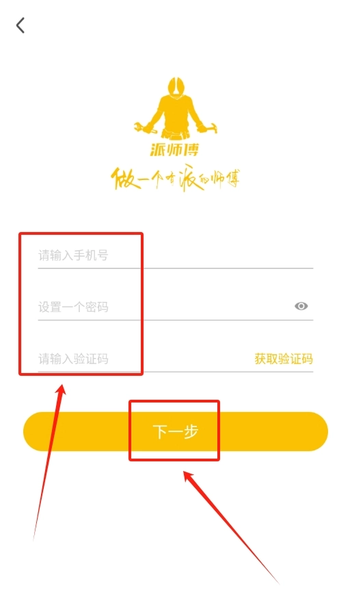 1、完成下载安装与账号注册:在应用市场搜索派师傅,下载并安装完成后,按照提示进行注册并成功登录账号。