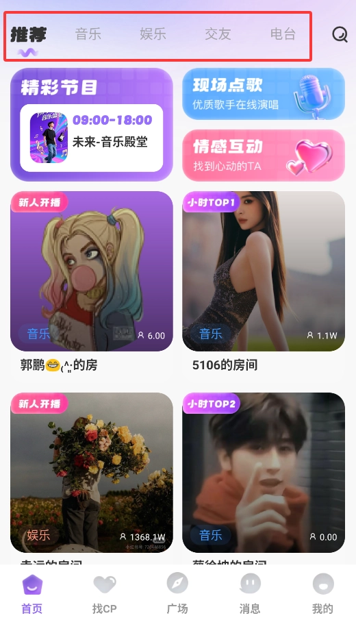 1. 打开APP后,首页底部的导航栏设有音乐厅、语音交友、电台直播等核心功能,轻点就能切换体验。