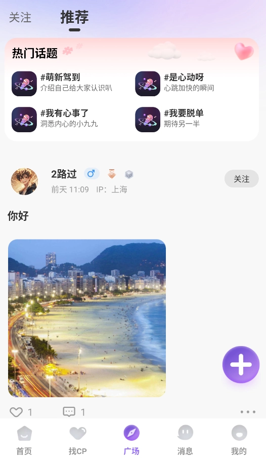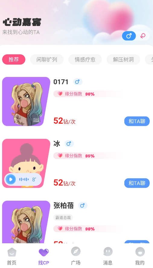 2、借助“CP匹配”功能设定偏好条件(比如声音类型、兴趣标签等),系统每天会推荐契合度高的用户。