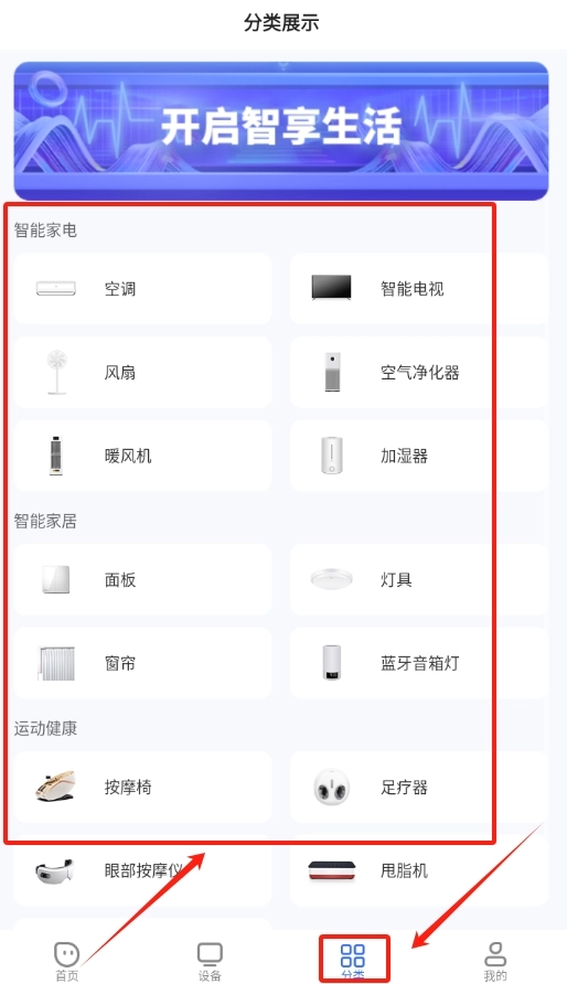 3、在分类页面里有各种不同类型的智能家电,找到想连接的设备点击就能使用。