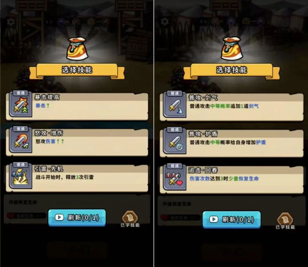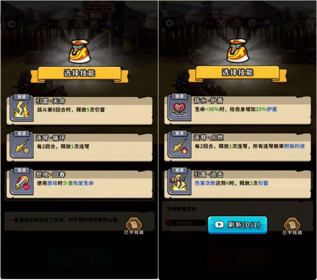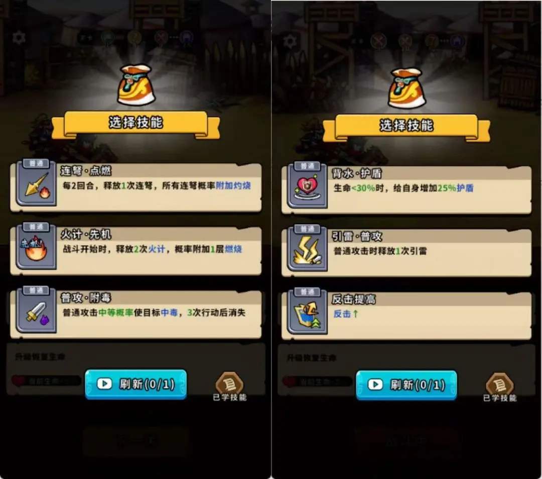(1)要是三个技能都和概率相关,既能够通过看广告来刷新技能,也能挑选带概率的技能。不过,最好别选那种3次行动后就消失的技能,即便其概率相对较高。毕竟处于初期阶段,仅靠打小兵来使用这个技能会显得有些浪费。在这种情况下,选择释放2次火计更为合适。