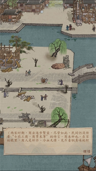 以宋代为故事背景,凭借细腻的水墨画风,鲜活再现古代市井的热闹繁华。从依傍河水兴起的古城,到青石板路两侧排列紧密的店铺,都让玩家仿佛穿越时空,置身于那个久远的时代,沉浸式踏上传奇的商途之旅。