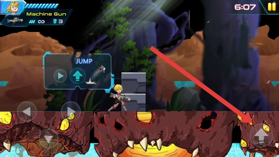 1. 首先要熟悉基础操作,利用方向键来控制角色移动,按下空格键实现跳跃,通过鼠标点击或者按下特定按键来释放机枪进行射击,以此应对场景里的地形障碍。