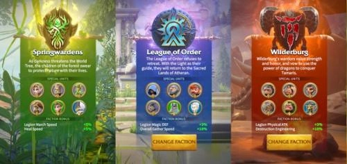 您需先从3个可选派系里挑选一个,分别是秩序联盟(人类)、Springwardens(精灵)以及Wilderburg(兽人) 。每个派系皆具备独特的单位、建筑设计、能力,还有专属英雄。接下来,您能够建设自己的城市,采集资源,训练并部署单位与其他玩家展开战斗,还能够组建联盟。
