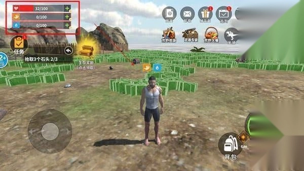 3、位于左上角的三条颜色条,分别代表生命值、饥饿值与水分。只有维持足够的数值,才能确保正常生存。