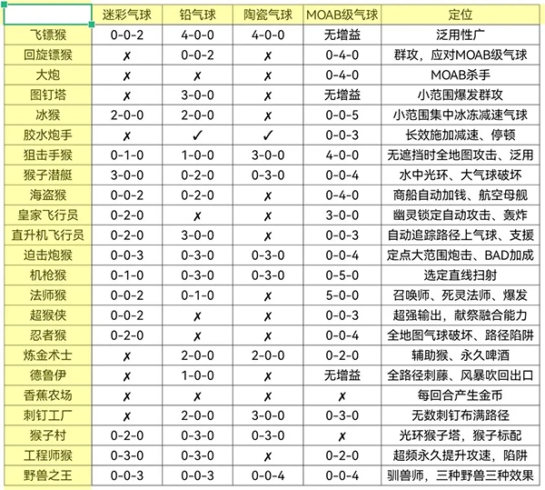 以下表格呈现了各类猴子针对不同种类气球的技能加点建议(例如 0 - 0 - 2 表示技能第三分支的第二个技能),同时还给出了每种猴子的定位。若有疑问,可在评论区留言,我会尽可能通过发图来解答。