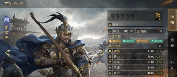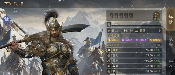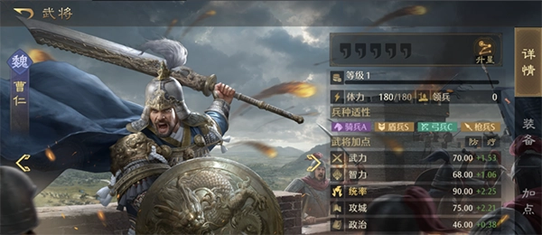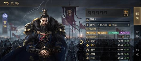 不同武将对于各兵种都有相应的适应性数值,在武将体力条下方,以BAS来表示。兵种适应度直接决定武将的属性值,适应度越高,属性值也就越高。例如,S代表120%的属性值,A代表100%,B代表80% 。