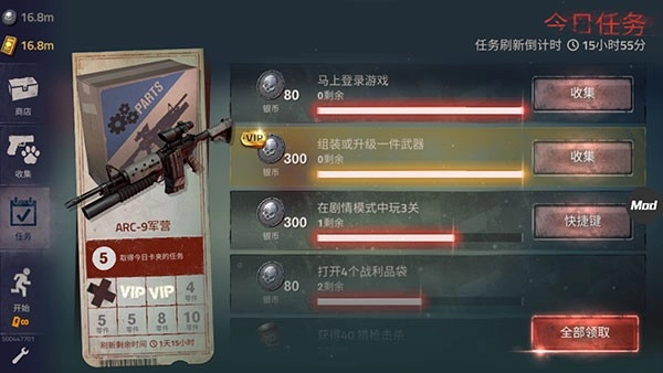 整个游戏最良心之处在于,任务完成会给予金银币、零件,完成七个任务还额外送金。大家尽量把所有奖励都拿到手,哪怕是你不喜欢的枪的零件,毕竟一旦集满了,后续就不会再出现了,就像我现在这样(虽说还没集满) 。