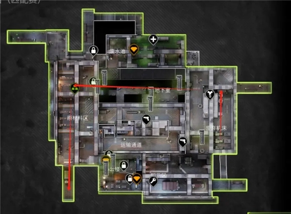 给萌新提个建议,不妨先熟悉工厂这张地图。这张图室内战斗居多,对枪环境公平,对萌新很友好。在巴夫工厂,新手可以选择从废弃机床区出发,途经地下室,前往原材料区搜图然后撤离(大致行动路线如下图所示,从地下室上来要路过运输通道)。这两个区域配件与材料较为丰富,主要能开出武器配件,还能顺便收集些铁片。最重要的是,这两个地方相对安全。进入地图时,建议带上一个铭牌,如此一来,撤离点就能视实际情况而定,哪边安全就从哪边撤离。