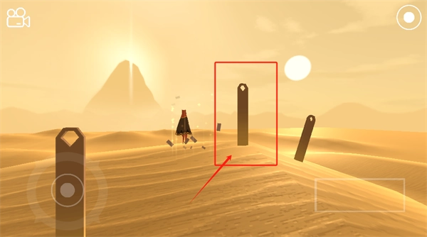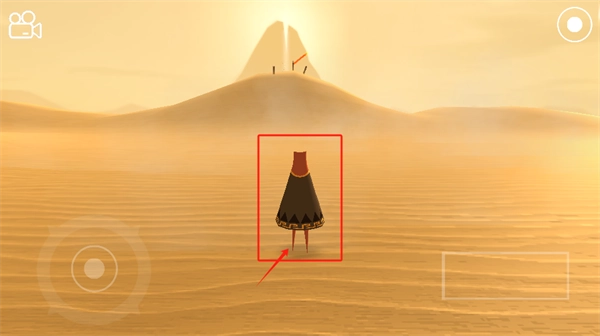 2. 通过操控左下角的摇杆,来控制红框内红脖子人物的移动,其移动目标是朝着远处发光的山顶行进。