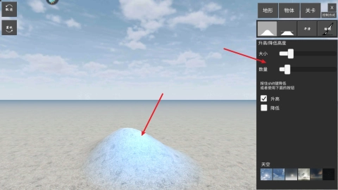 3、点击被蓝色光照亮的位置,让地形向上凸起或者向下凹进。