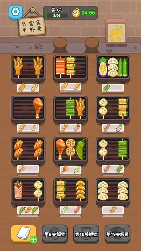 疯狂烧烤摊这款游戏,整体操作玩法简单又魔性。仅需简单的拖动与点击,把三根一样的烤串碰在一起,就能轻松应对消除挑战。要是成功消除全部烤串,便能顺利完成更多烧烤订单。