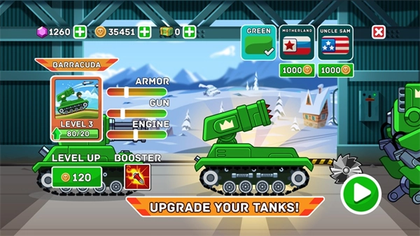 为满足广大玩家的需求,《山地坦克大战》还提供了大量坦克供玩家解锁。而且,玩家可以对每一辆坦克进行升级强化,提升各项属性。升级后的坦克能让玩家充分体验秒杀敌人的快感。