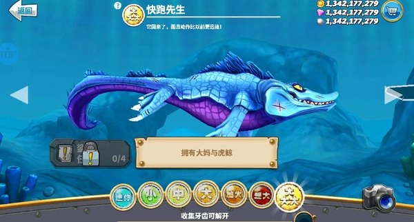 2、通过进行游戏获取积分,当积分条满格后,即可解锁该型号鲨鱼,随后使用金币购买。