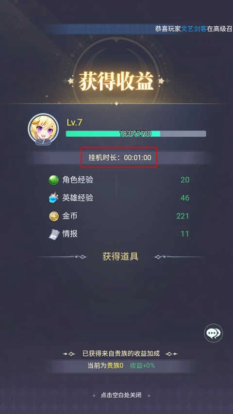 5、闯关结束后,记得回到主界面领取挂机宝箱哦。通关的数量越多,挂机的时长越久,获得的奖励也就越丰厚。