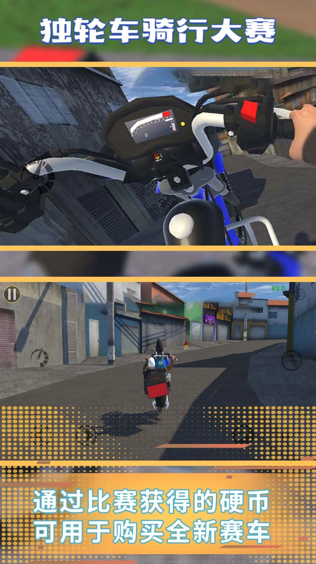 独轮车骑行大赛是一款既简单又充满趣味的竞速游戏。玩家在游戏里能收获更多欢乐,比赛过程中,玩家得凭借自身技巧,施展出各类高难度招式。每用出一个动作,玩家就能获取更高分数,进而赢得游戏胜利。游戏内有超多款式的摩托车,会随着游戏推进逐步解锁,玩家可挑选自己心仪的车子参赛。