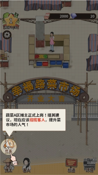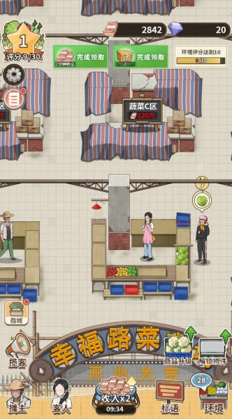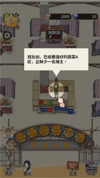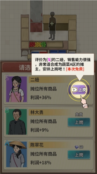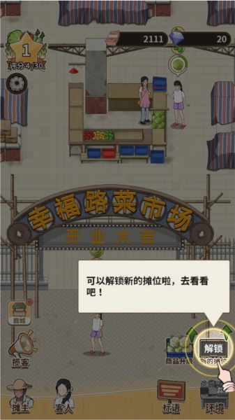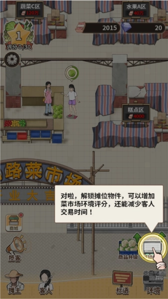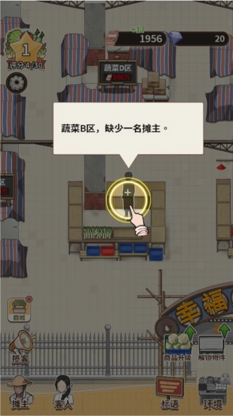 2. 市场里设有众多摊位,一开始仅开放蔬菜区,后续玩家需使用货币来解锁其他区域。每个新开启的摊位都得招募一位摊主,摊主的销售能力越强,该摊位所获得的收益也就越大。