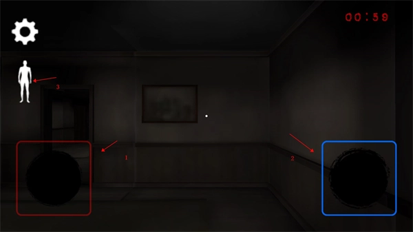 4、在下图中,按钮1用于控制人物行动,按钮2用来控制人物视角方向,按钮3则负责控制人物蹲下或站起。玩家只需通过操控人物成功逃离房间,就能完成通关。